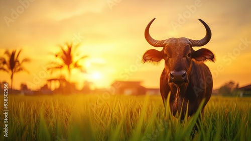 A buffalo stands in a field of tall grass. The sun is setting in the background, casting a warm glow over the scene. The ox's horns are prominently displayed, adding a sense of strength