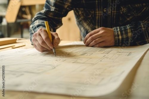 A builder carefully marking measurements on a large blueprint spread over a sturdy work table.
