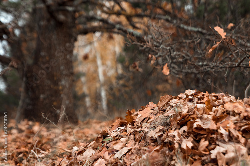 A bunch of autumn, yellow foliage on the ground, cleaning the leaves. Work in the garden. Concept autumn, yellow leaves, autumn mood. Copy space.
