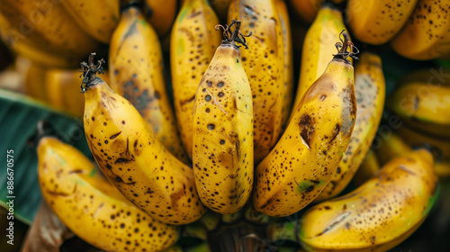 A bunch of bananas with brown spots on them