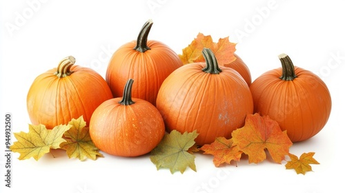 A bunch of pumpkins and leaves are arranged isolated on a white background. The pumpkins are of different sizes and are placed in various positions, while the leaves are scattered around them