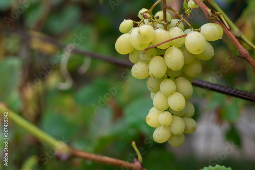 A bunch of white grapes with water drops hanging on a branch in a vineyard. Harvest concept. Copy Space