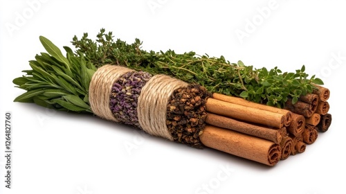 A bundle of aromatic herbs and cinnamon sticks wrapped in twine isolated on white. Generative AI
