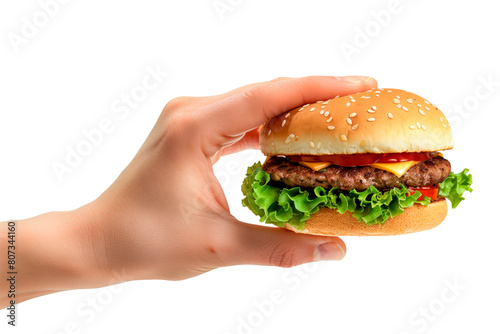 A burger in hand isolated on a white or transparent background. Close-up of a burger in hand, side view. Unhealthy consumption of fast food. Fast food photography.