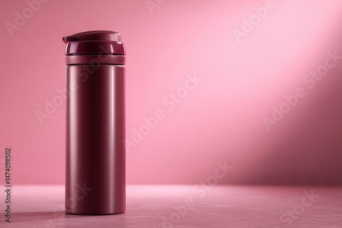bottle, insulated, water, burgundy, pink, background, stainless, metal, container, portable, closeup, object, product, design, still, life, modern, simple, shape, single, maroon, blood-red, shade, dark, light, lighting, horizontal, studio, isolated, surface, empty, top, cap, front, view, equipment, cool, trendy, minimalist, cylindrical
