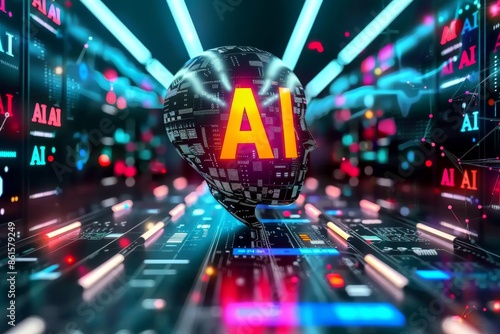 A burst of futuristic energy with a vibrant AI hologram in a high tech neon lit environment, perfect for illustrating cutting edge artificial intelligence technology concepts