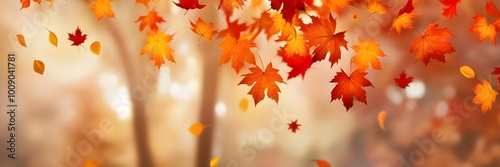 A burst of orange and red autumn leaves illuminated by bright light, creating a warm, dreamy bokeh effect.