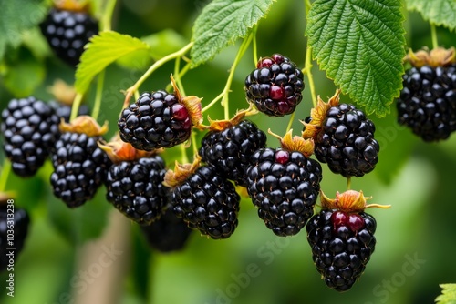 A bush of Rubus Fruticosus (Blackberry) covered with ripe, glossy blackberries, with clusters of berries and green leaves catching the light