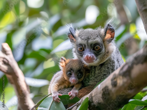 fur, furry, grey, big eye, primate, wildlife, cute, nurturing, nature, mammal, green leaf, tropical, animal, caring, tree, africa, motherhood, young, soft, bokeh, alert, branch, watching, endangered, forest, bonding, arboreal, wild, protection, innocence, togetherness, outdoors, parenting, delicate, vibrant, sunny