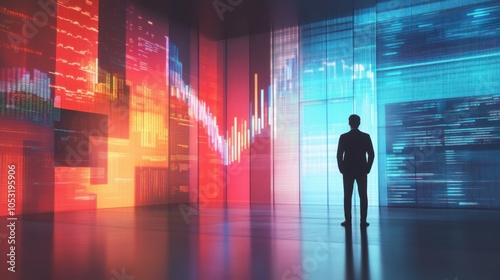 A business leader standing in front of a large screen filled with data visualizations, guiding