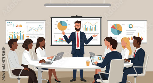 A business meeting with diverse team members and a presentation on a screen with charts and graphs shown