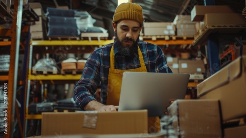 A business owner, wearing an apron, prepares warehouse parcel boxes after receiving online orders from customers via social media, while using a laptop.