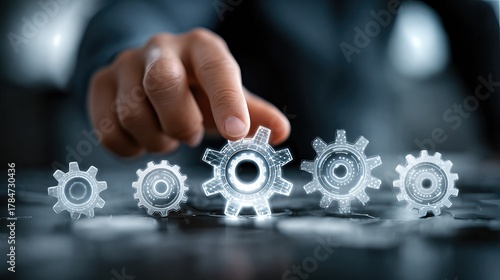 gear, technology, digital, hand, innovation, business, concept, system, automation, future, holographic, workflow, planning, design, interaction, work, engineering, solution, project, integration, communication, development, support, person, growth, suit, operation, idea, abstract, graphic, professional, corporate, organisation, ai, intelligence, holding, modern, office, leadership, futuristic, learning, businessman, connection, transformation, teamwork, success, optimization, mechanism, glowing