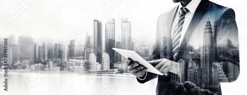 A businessman blends with a cityscape. The silhouette of a professional overlaps with urban structures, denoting a dynamic business environment. Man uses tablet at work.