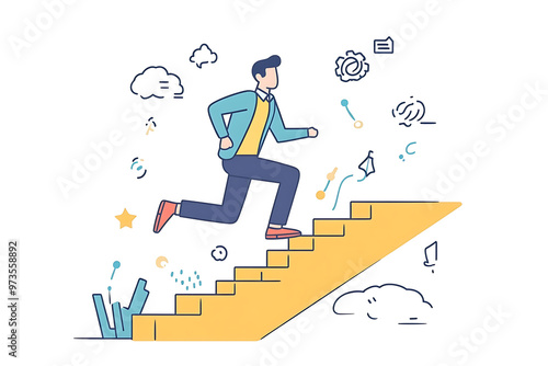 a businessman confidently running up stairs, symbolizing career growth and success. Simple shapes and vibrant colors.flat art style