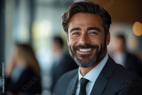 A businessman, dressed professionally, interacts with colleagues at a bustling conference, embodying confidence and collaboration.