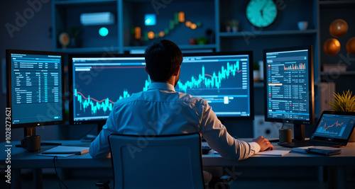 A businessman intently analyzing market data, seated at a sleek, modern desk with multiple monitors displaying financial graphs, charts