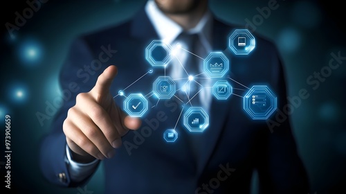 A businessman interacts with futuristic digital icons, representing technology, innovation, and connectivity in the modern age.