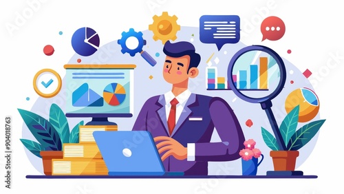 A businessman is working on his laptop, analyzing data presented as charts and graphs. A magnifying glass focuses on one particular chart, representing a focused approach to data analysis. The surroun