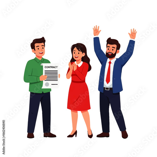 A businessman presents a signed contract, while two jubilant colleagues celebrate their successful deal with raised hands and applause.