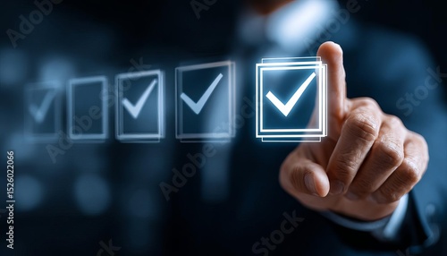 A businessman selecting a check mark on a digital interface.