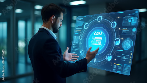 A businessman showcases a CRM system with a futuristic interface to support customer relationship management and database analysis needs._00002_
