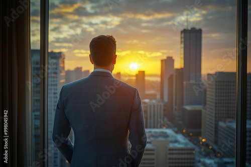 A businessman standing in an empty boardroom, looking out the window at the city skyline, with golden hour lighting.