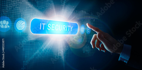 A businessmans hand selecting a IT Security business word concept on a computer display.