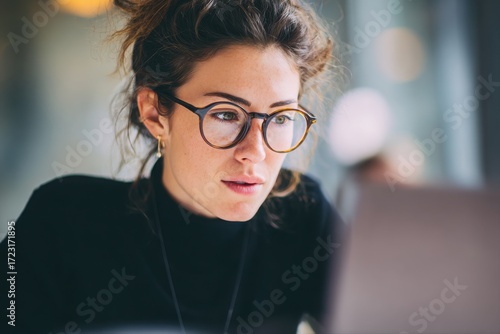 a businesswoman glasses and working on her laptop in an office, close-up shot with blurred background.