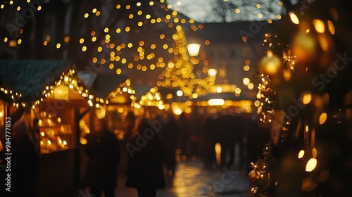 A bustling Christmas market at night, illuminated by warm yellow lights.