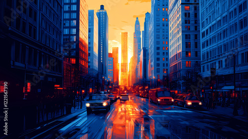 A bustling city street with towering skyscrapers reflecting the golden glow of the setting sun the gradient skyline shifts from vibrant orange to dark indigo. Indigo Horizon. Illustration