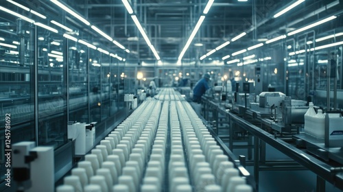 A busy dairy factory production line with rows of milk bottles being processed, filled, and sealed for packaging, emphasizing automation and speed.