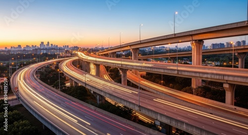 tied-up, highway, interchange, multiple, lane, sunset, transportation, building, city landscape, urban, city, overpass, traffic, light, trail, lane, skyline, night, train, road, railway, car, transport, travel, station, railroad, rail, street, speed, light, sky, bridge, motion, car, expressway, track