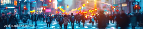 A busy urban scene with anonymous people walking on a rainy street, blurred city lights creating a vibrant night atmosphere. Free copy space for banner.