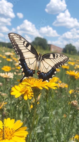 butterfly, flower, nature, field, yellow, sky, cloud, pollination, beauty, wildlife, summer, garden, flora, fauna, ecosystem, colours, insect, wing, bloom, landscape, environment, habitat, season, sunlight, growth, nectar, delicate, vibrant, peaceful, scenic, fresh, calmness, agriculture, biodiversity, colourful, species, macro, closeup, photo, natural, serene, pollinator, meadow, sunshine, exploration, adventure