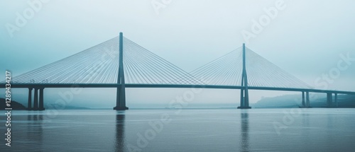 A cable-stayed bridge stands amidst dense fog, with its towers soaring boldly, blending engineering with atmospheric wonder.