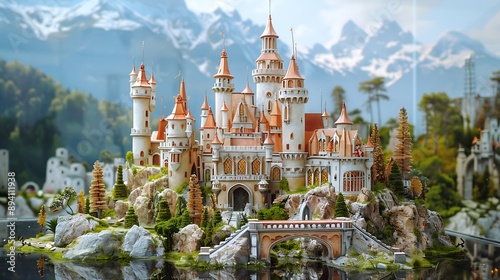 A cake designed to look like a fairy tale castle, with intricate turrets, beautiful windows, and a drawbridge. The background includes a fantasy kingdom with majestic mountains and a clear blue sky,