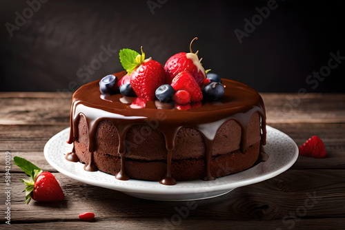 A cake with chocolate icing and berries on top