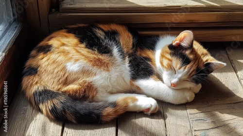 cat, sleeping, calico, sunlight, floor, wood, pet, animal, cosy, peaceful, rest, indoor, home, fur, cute, small, nature, relaxation, whisker, paw, curled, comfortable, beauty, calmness, felino, companion, lazy, warmth, shadow, breed, playful, soft, colours, orange, black, white, domestic, sleepy, adorable, environment, window, serene, nap, meow, cuddly, love, joy, companionship, happiness