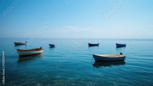 A calm blue sea with small boats floating peacefully near the shore.