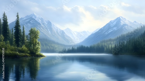 A calm lake reflecting towering mountains and lush trees, rendered in oil painting style, with intricate hand brushstrokes capturing every detail of the serene landscape.