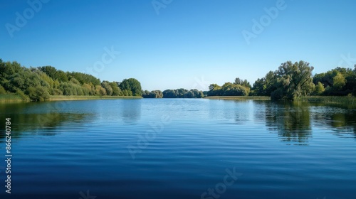 A calm lake with trees in the background