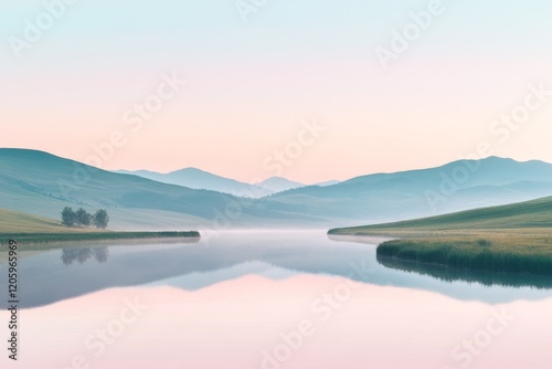 A calm river flows through the center with subtle reflections of the surrounding mountains
