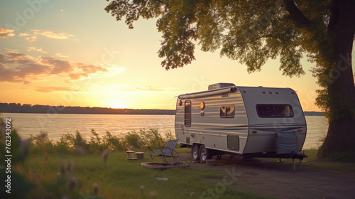 A camper parked next to a serene lake at sunset. Perfect for travel and outdoor adventure concepts
