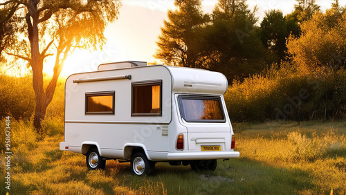 A camper van parked in a scenic landscape during sunset. Travel with camper?van?or motorhome. Resting on an active family vacation on a road trip.