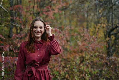 authenticity, candid, portrait, woman, autumn, forest, wood, dress, burgundy, smile, genuine, spontaneous, emotion, mood, lighting, scene, photo, frame, nature, colours, texture, background, casual attire, relax, expression, daylight, season, foliage, leaf, breeze, calm, graceful, apparel, fabric, waist, belt, pose, camera, view, subject, vantage, depth, harmony, balance, realism, authentic