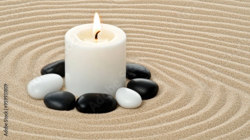 A candle sits serene at the center of black and white pebbles in raked sand, creating a peaceful atmosphere perfect for meditation and reflection