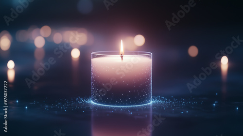 A candle surrounded by a holographic light aura, digital reflections bouncing off the flame, glowing with soft purple and blue tones, 4K studio shot, futuristic