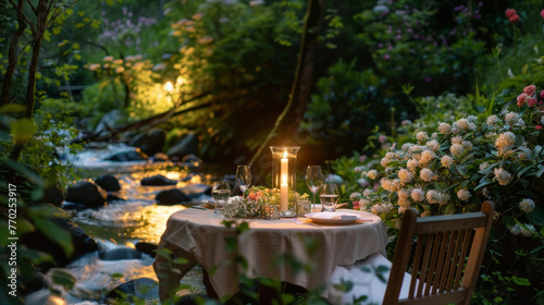 A candlelit dinner table set for two nestled in a secluded garden with blooming flowers and a gentle stream trickling by. . .