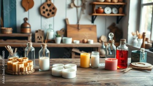 A candle-making studio with wax molds, scent bottles, and finished candles on rustic wooden table, scent bottles, creativity